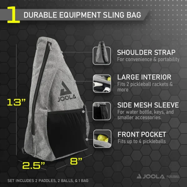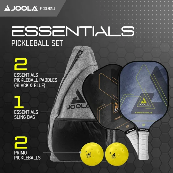 Includes two JOOLA Essentials pickleball paddles, two JOOLA Primo outdoor balls, and a JOOLA Essentials sling bag for convenient carrying.